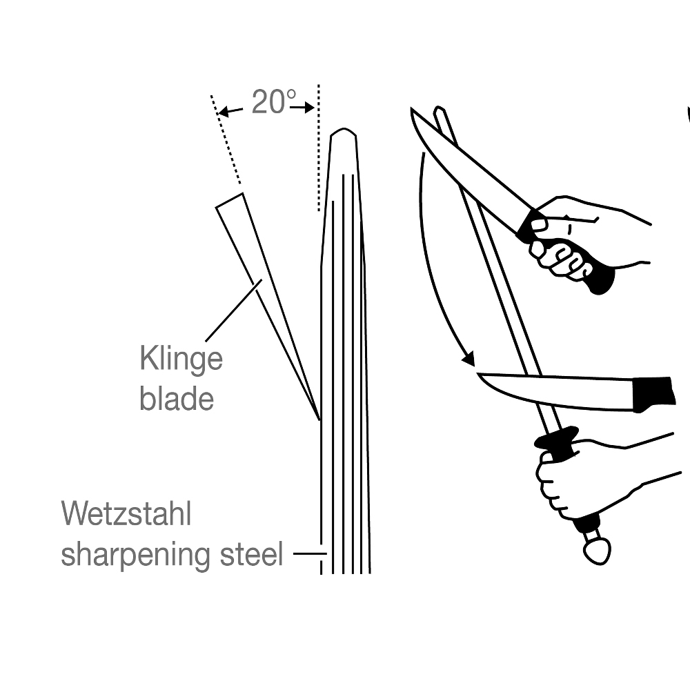 • •    Kippen Sie das Messer so, dass zwischen Messerklinge und Wetzstahl / Schärfstab ein Winkel von 20 Grad ist.