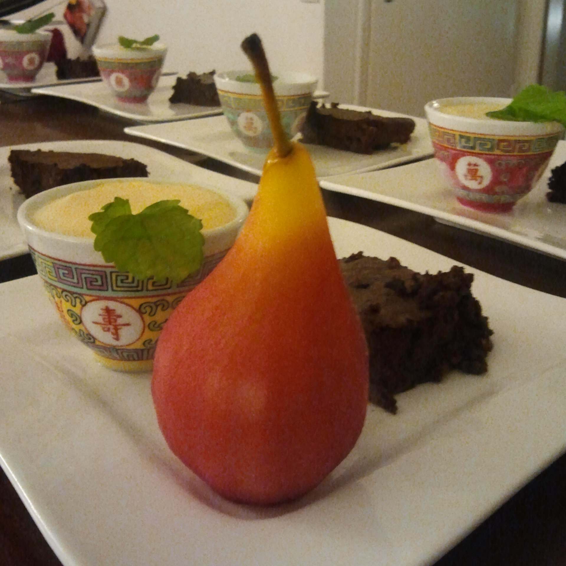 Birnen aus dem Wein heben. Den Wein, wenn gewünscht, mit Speisestärke eindicken.