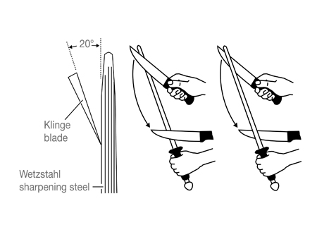 • •    Kippen Sie das Messer so, dass zwischen der Messerklinge und Wetzstahl / Schärfstab ein Winkel von 20 Grad entsteht.