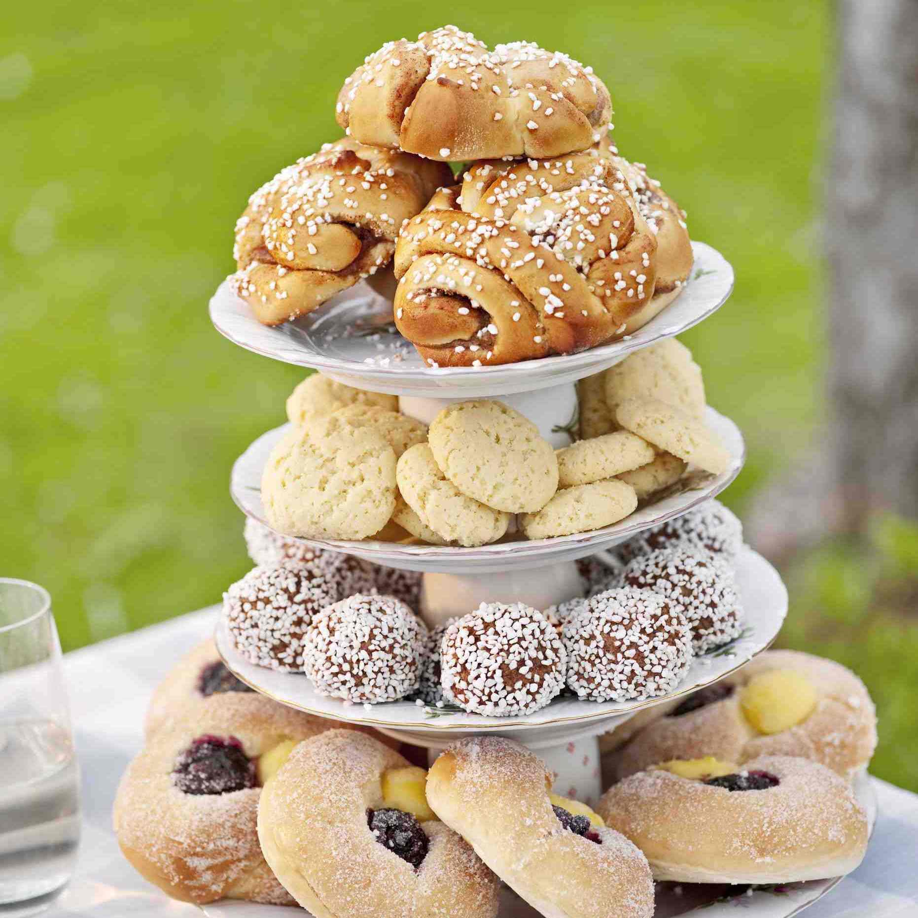 Eine über 150 Jahre alte schwedische Tradition besagt, dass zu einer richtigen Fika immer mindestens sieben verschiedene Gebäcksorten angeboten werden müssen selbstverständlich aus eigener Hand gebacken. Natürlich wird diese Tradition auch in Schweden heutzutage nicht mehr so intensiv gelebt, für köstliche Abwechslung wird dennoch regelmäßig gesorgt. Ob Arraksboll, kleine aus Margarine, Haferflocken, Kekskrümeln, Zucker und Arakaroma bestehende Rumkugeln, klassische Schokoladenkuchen oder schwedische Mandeltårta für jeden Geschmack bietet eine Fika leckere Naschereien. Sehr beliebt und besonders empfehlenswert sind Mazarine, eine Art Kuchen, bestehend aus Mürbeteig gefüllt mit Marzipanrohmasse oder Chokoladboll, kleine Schokobällchen die schnell zubereitet sind und nicht gebacken werden müssen. Zwischen Januar und April wird in Schweden zu einer Fika klassischerweise Semla gereicht eine süße Sünde aus fluffigem Hefeteig, Marzipan, Kardamom und Sahne.