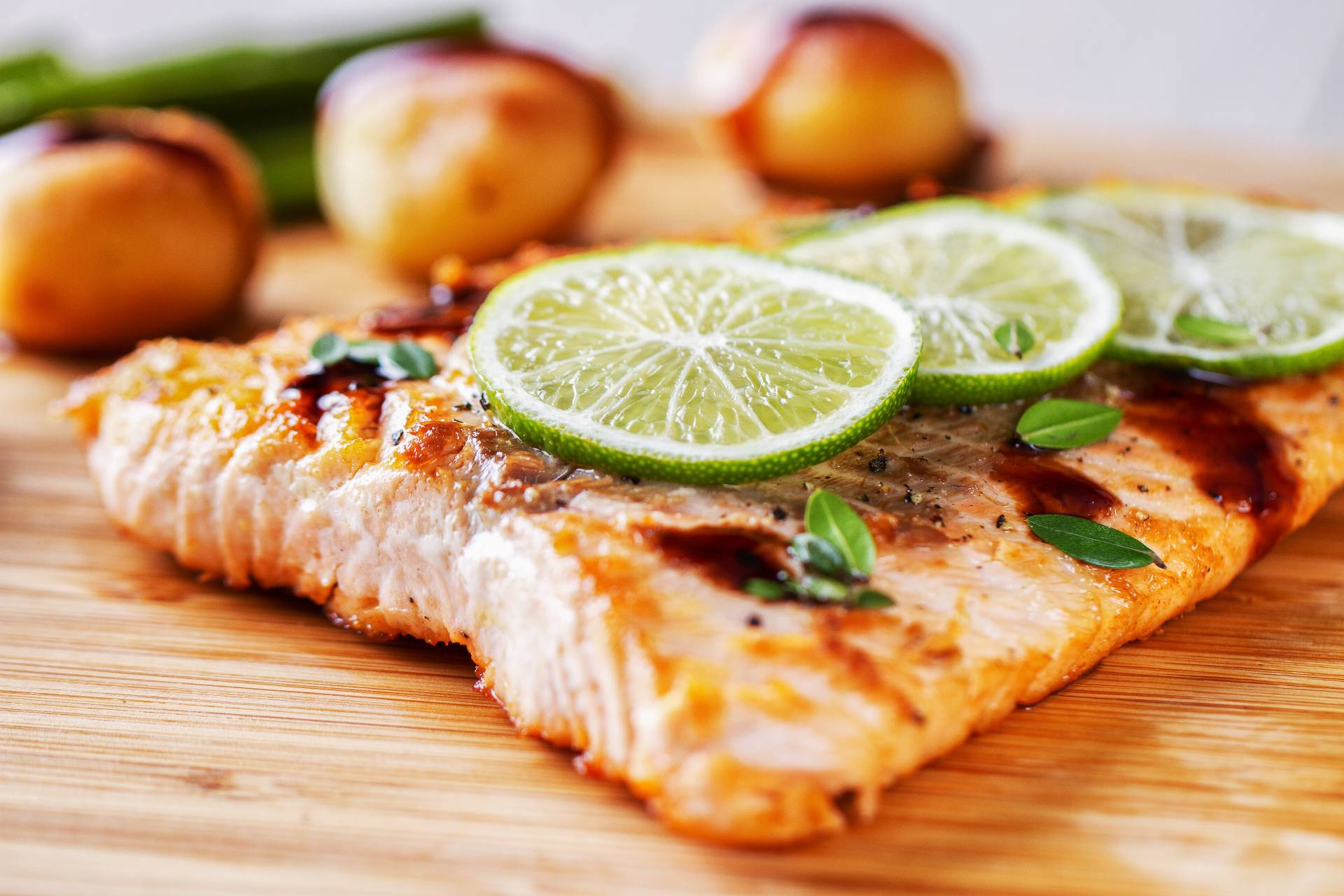 Die Stücke bei direkter Hitze grillen. Wenn der Span ein wenig verbrannt ist, nur noch indirekt weiter grillen. Der Lachs sollte 3–4 Minuten garen. Achten Sie darauf, dass das Fischfleisch weich bleibt.