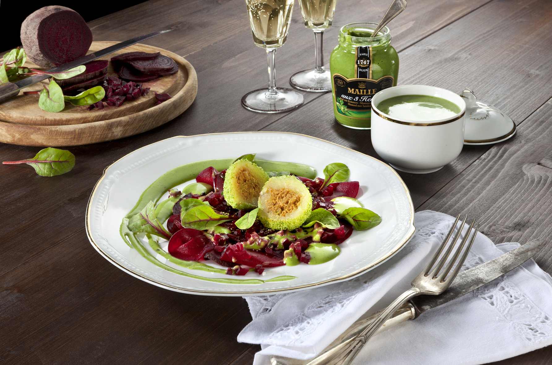 Lauwarme Rote Bete mit Kräuter-Senf-Dressing und provenzalischem Kartoffel-Senf-Knödel